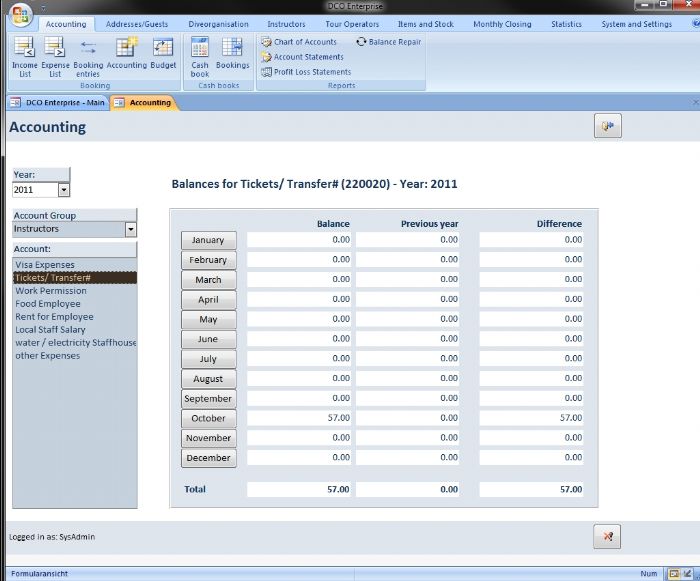 For each account you can get a very fast balance overview and can easily open the booking list. The system automatically compares the balances with the previous year. |