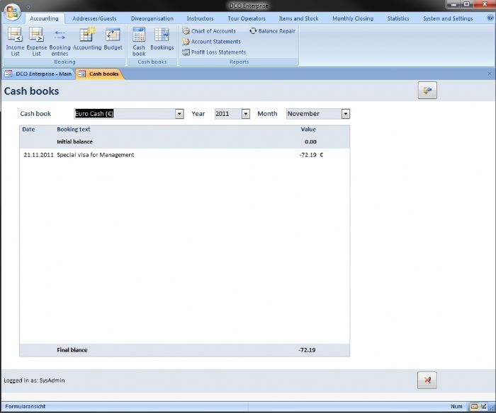 Accounting is split into income/expense accounts, the administration of cash books, and many different reports and statistics.