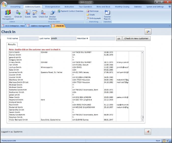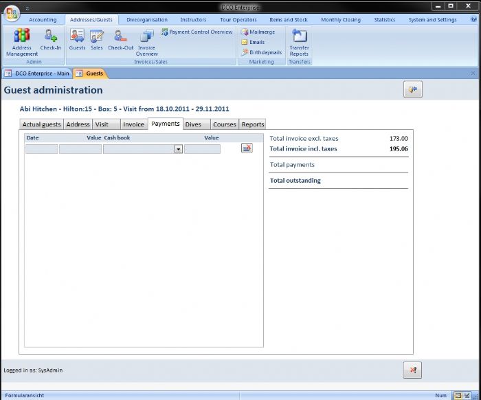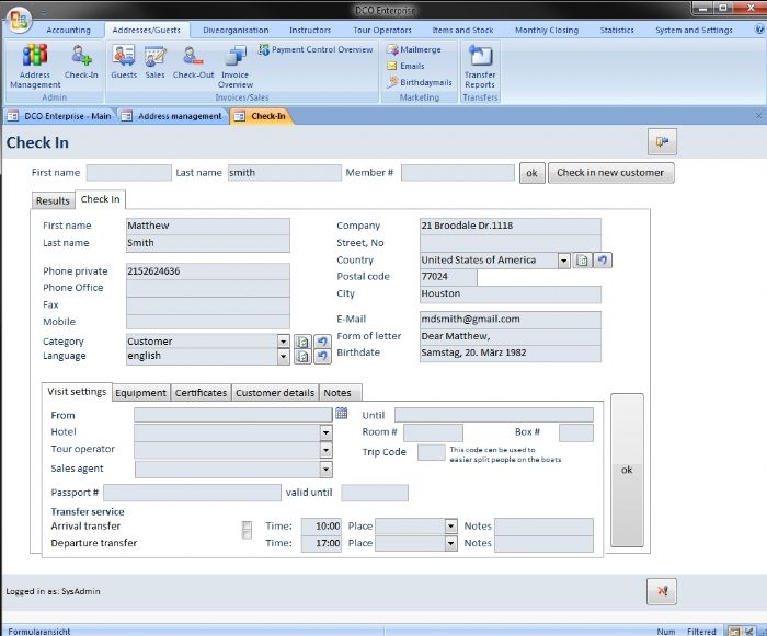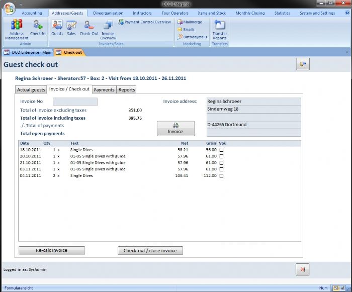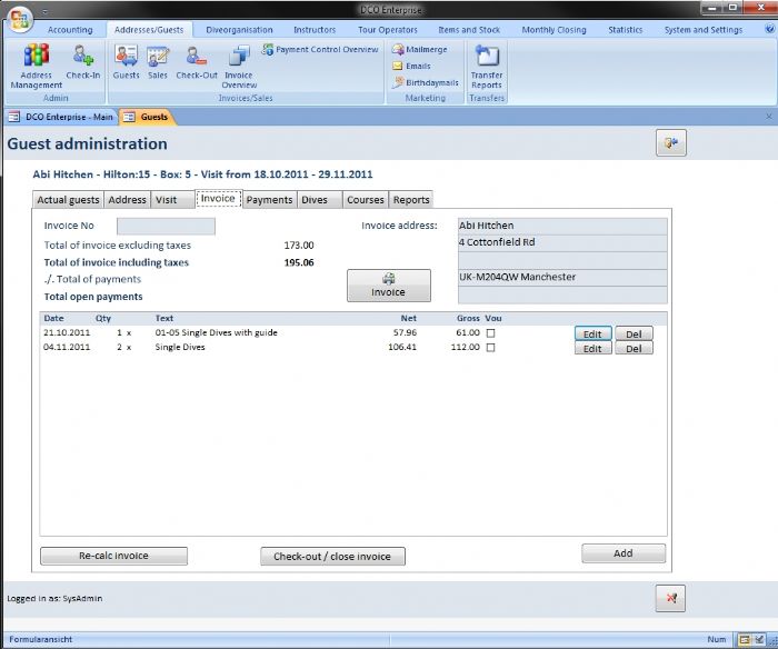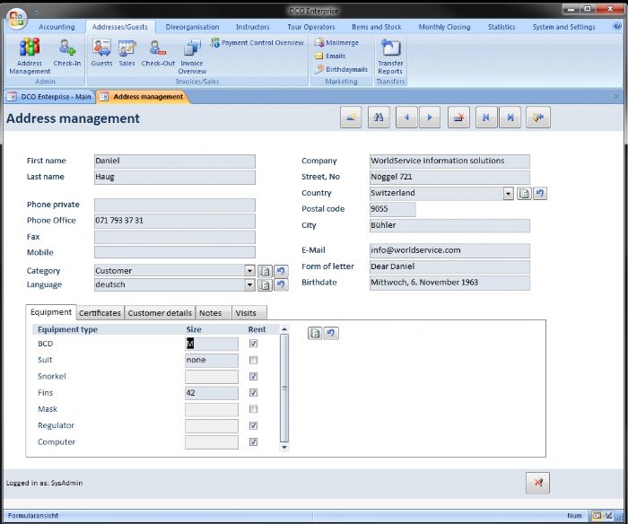 On the first page you see a list of all actual guests and after clicking on the one you want to administrate you see different folders with other functions pertaining to the address, visit, sales, invoice, dives, courses, etc. |