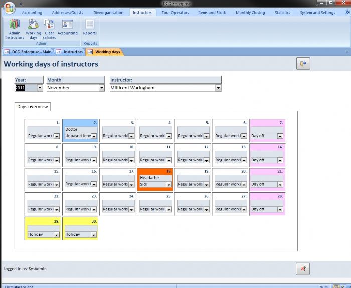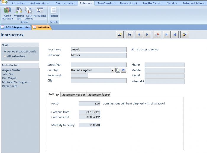 The administration of active instructors let you handle not only the personal data but information about salaries, commission factors and contract details. |